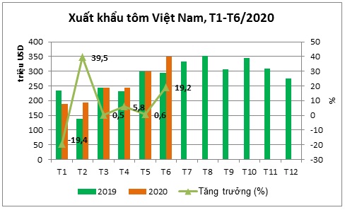 (vasep.com.vn) Tháng 6/2020, XK tôm Việt Nam đạt 349,9 triệu USD, tăng 19,2% so với tháng 6/2019. Đây là mức tăng trưởng tốt nhất kể từ tháng 3/2020. Lũy kế 6 tháng đầu năm nay, XK tôm đạt 1,5 tỷ USD, tăng 5,7% so với cùng kỳ năm ngoái. Đây là kết quả đáng khích lệ trong bối cảnh dịch Covid-19 vẫn còn tiếp diễn ở các thị trường chính.