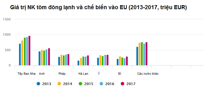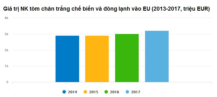 Năm 2017, tổng giá trị NK tôm các loại đông lạnh và chế biến vào EU đạt 4,2 tỷ EUR trong đó tôm chân trắng chiếm hơn 70% (gần 3,1 tỷ EUR). So với năm 2013, giá trị NK tôm chân trắng năm 2017 tăng 33%. Khối lượng NK tăng ít hơn giá trị trong giai đoạn này do giá tôm toàn cầu tăng do nguồn cung khan hiếm trước đại dịch EMS.