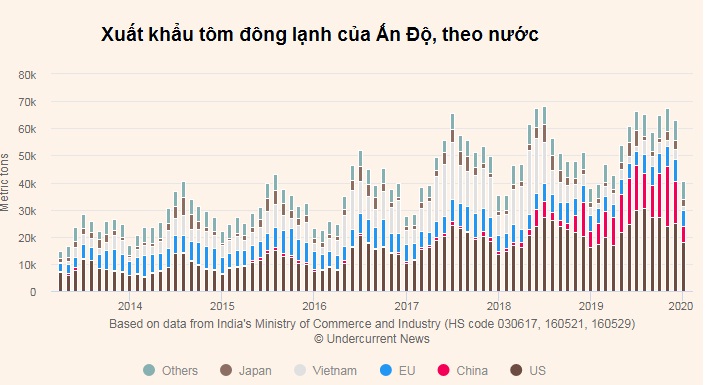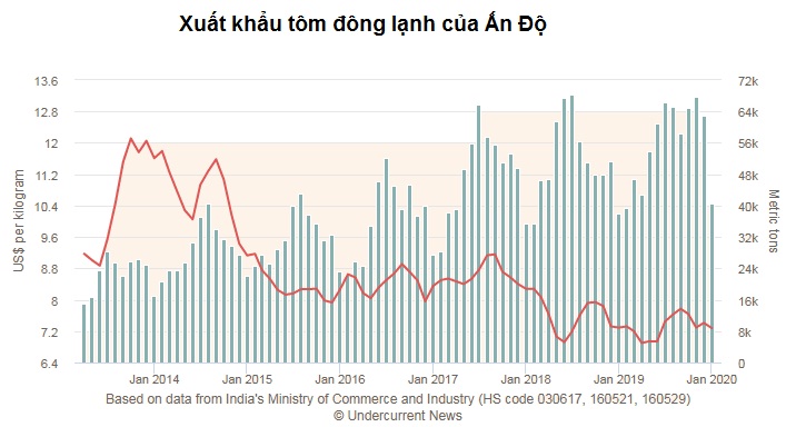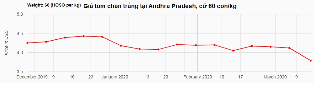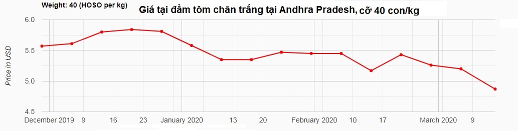 Giá tôm Ấn Độ liên tục giảm từ cuối tháng 2/2020 do Trung Quốc giảm NK, khiến dư cung, giá tôm thế giới cũng chịu áp lực giảm, đồng thời các nhà chế biến tôm tại Ấn Độ cũng không mua nhiều do không đảm bảo được đầu ra.