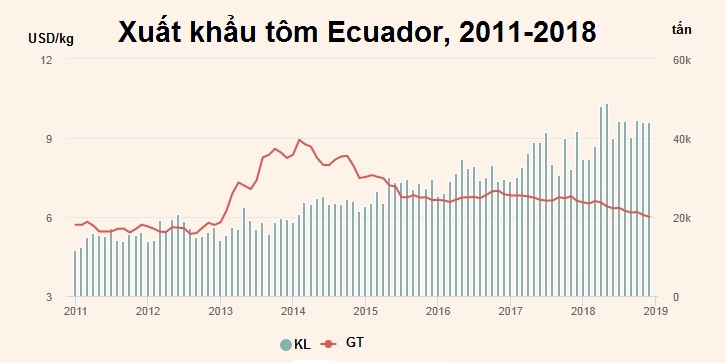 Việt Nam là thị trường NK lớn nhất của tôm Ecuador, chiếm 40% tổng khối lượng XK tôm của Ecuador. Năm 2018, Ecuador XK 204.552 tấn tôm sang Việt Nam, giảm 6% so với năm 2017. Giá XK trung bình đạt 6,07 USD/kg, giảm 6,3% so với năm 2017.
