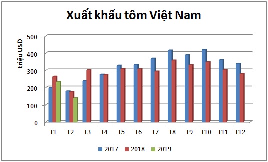 Hai tháng đầu năm 2019, XK tôm Việt Nam sang 5 thị trường chính đều giảm trong đó giá trị XK sang EU giảm mạnh nhất 27,6%, Nhật Bản giảm 0,9%, XK sang Trung Quốc, Mỹ và Hàn Quốc giảm lần lượt 1,6%, 19,2% và 18%. Trong tháng 2/2019, duy nhất XK tôm sang thị trường Nhật Bản tăng 14,7%, XK sang các thị trường còn lại đều giảm.