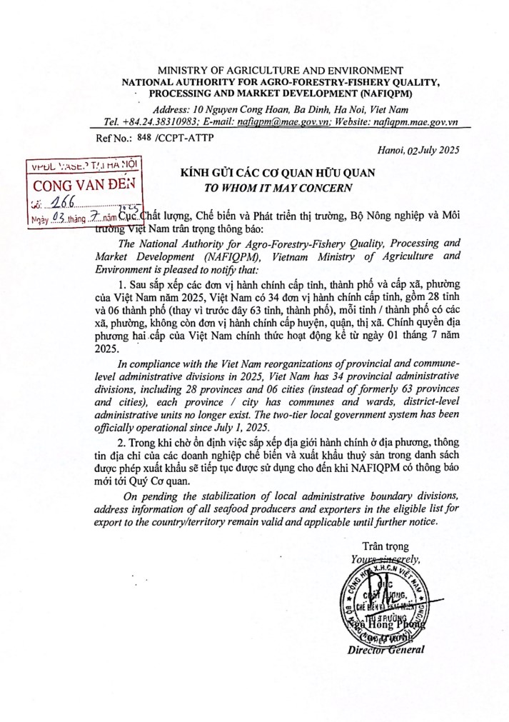 Ngày 02/7/2025, Cục Chất lượng, Chế biến và Phát triển thị trường (NAFIQPM), Bộ Nông nghiệp và Môi trường Việt Nam đã đưa ra thông báo số 88/CCPT-ATTP về việc thay đổi địa chỉ của doanh nghiệp sau khi có thay đổi địa giới hành chính.