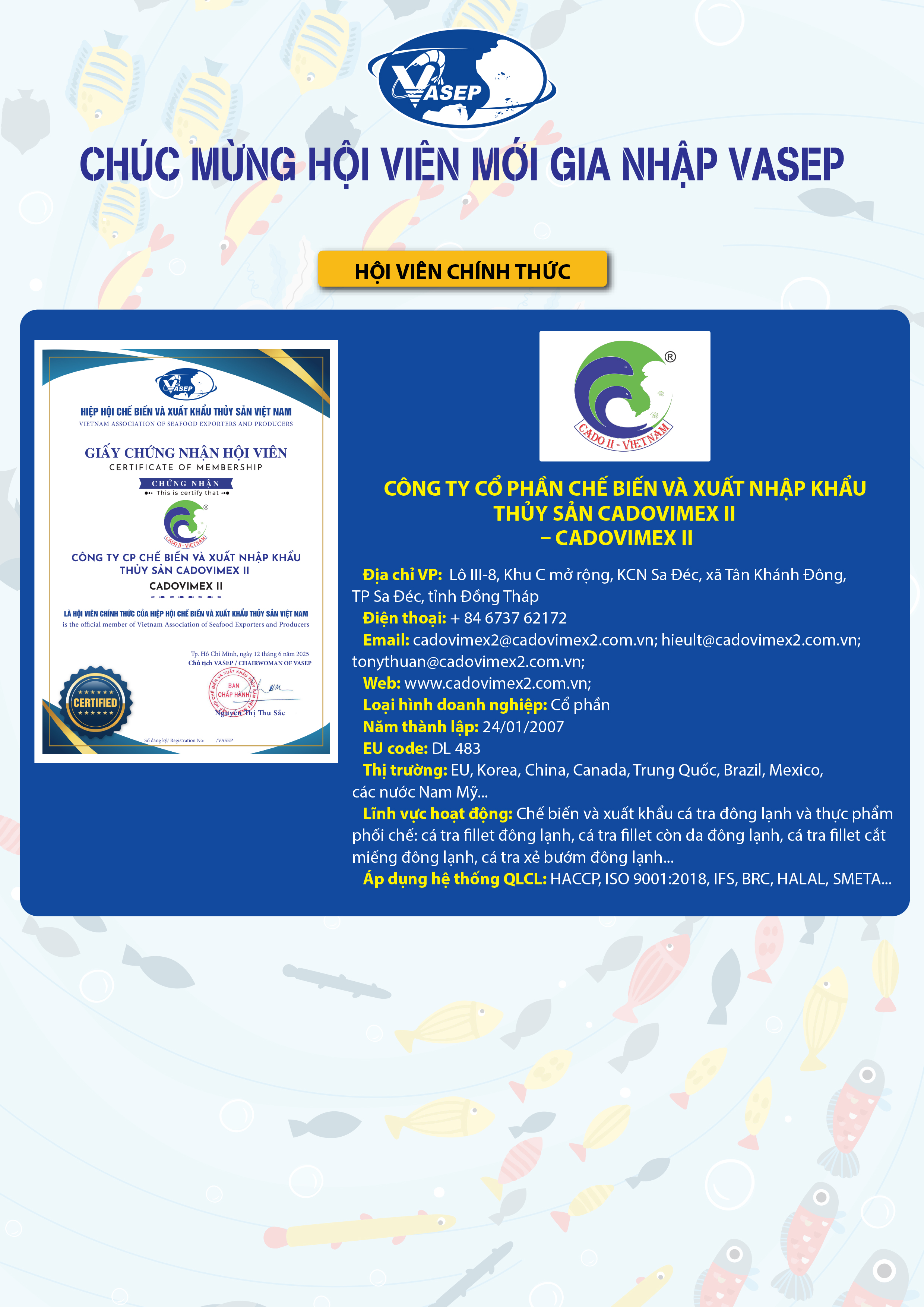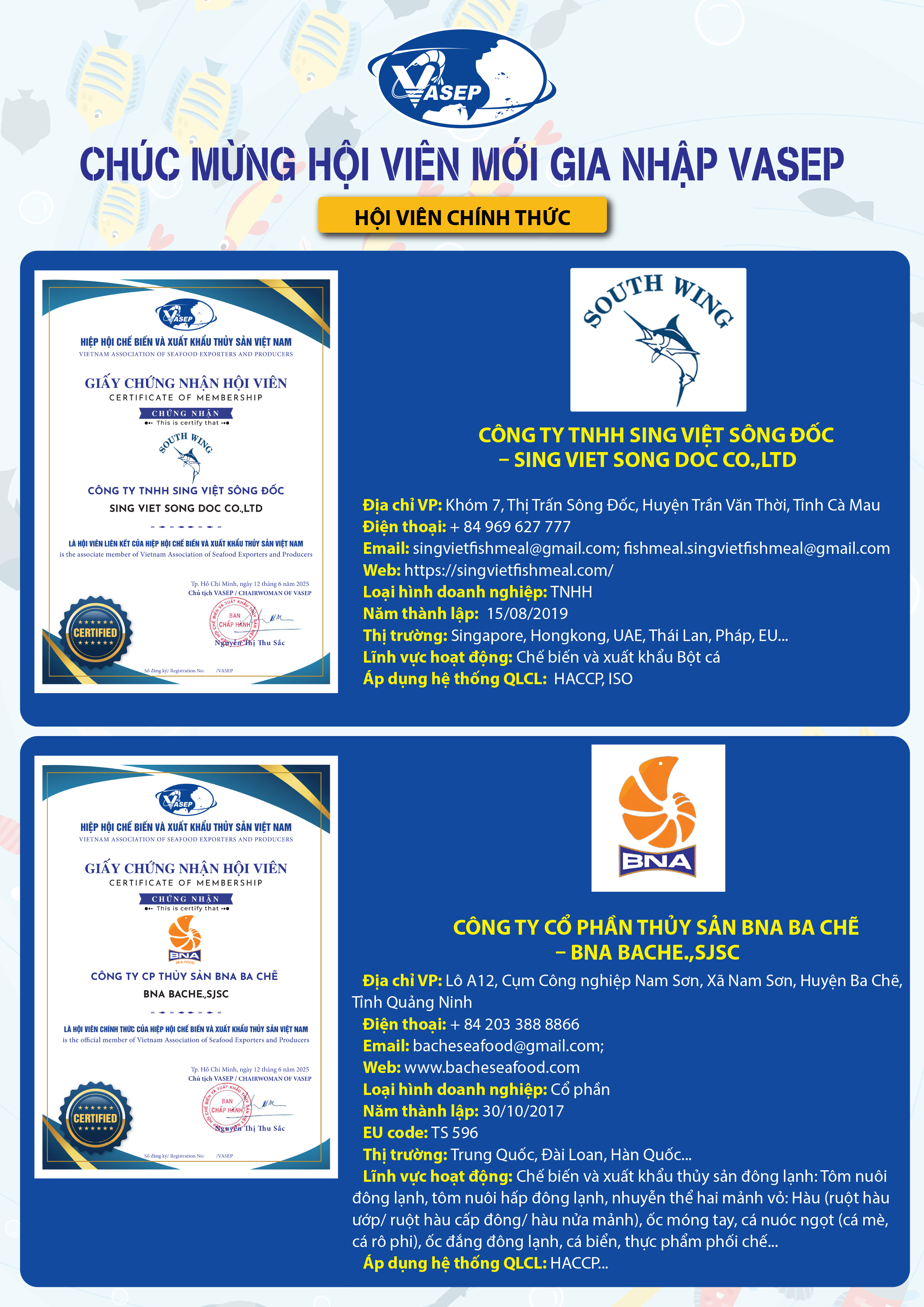 Trong tuần qua, đã có thêm 11 Hội viên gia nhập VASEP. Chúc các doanh nghiệp ngày càng phát triển, cùng VASEP gắn kết bền chặt, nâng cao chất lượng và thương hiệu ngành thủy sản Việt Nam vươn xa toàn cầu!