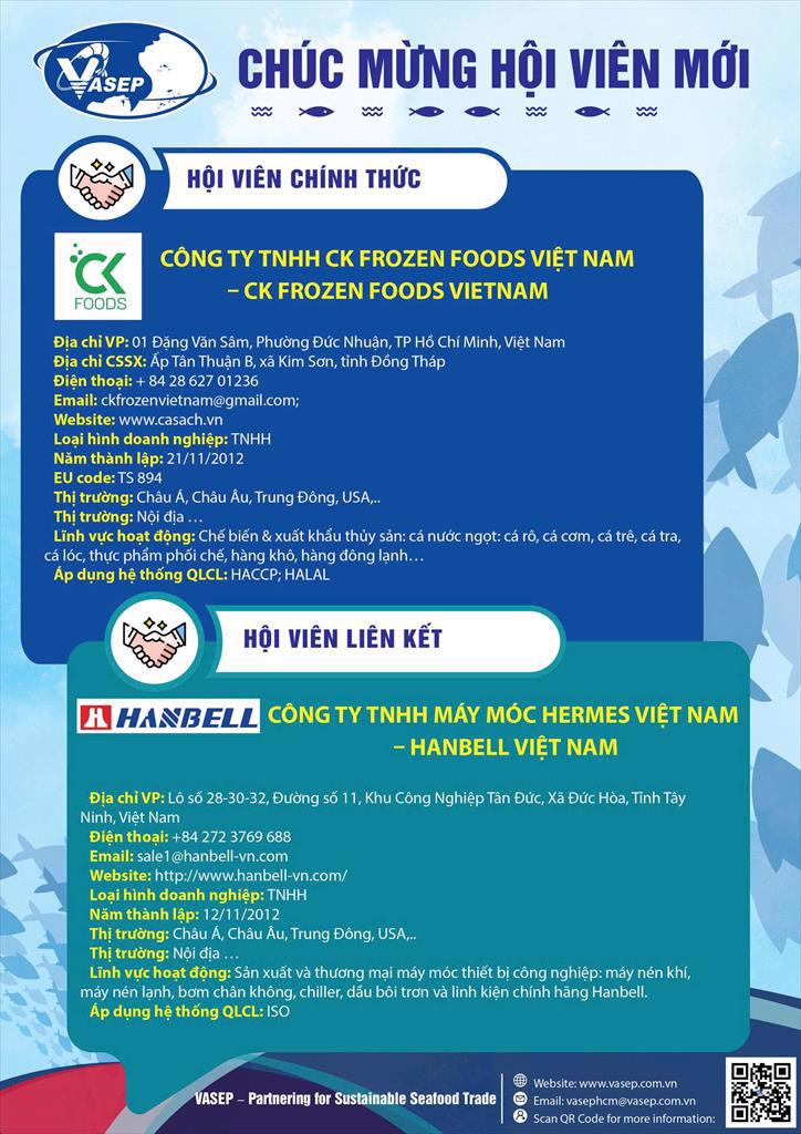 (vasep.com.vn) Trong tuần qua, đã có thêm 02 Hội viên gia nhập VASEP. Chúc Quý doanh nghiệp ngày càng phát triển, cùng VASEP gắn kết bền chặt, nâng cao chất lượng và thương hiệu ngành thủy sản Việt Nam vươn xa toàn cầu!