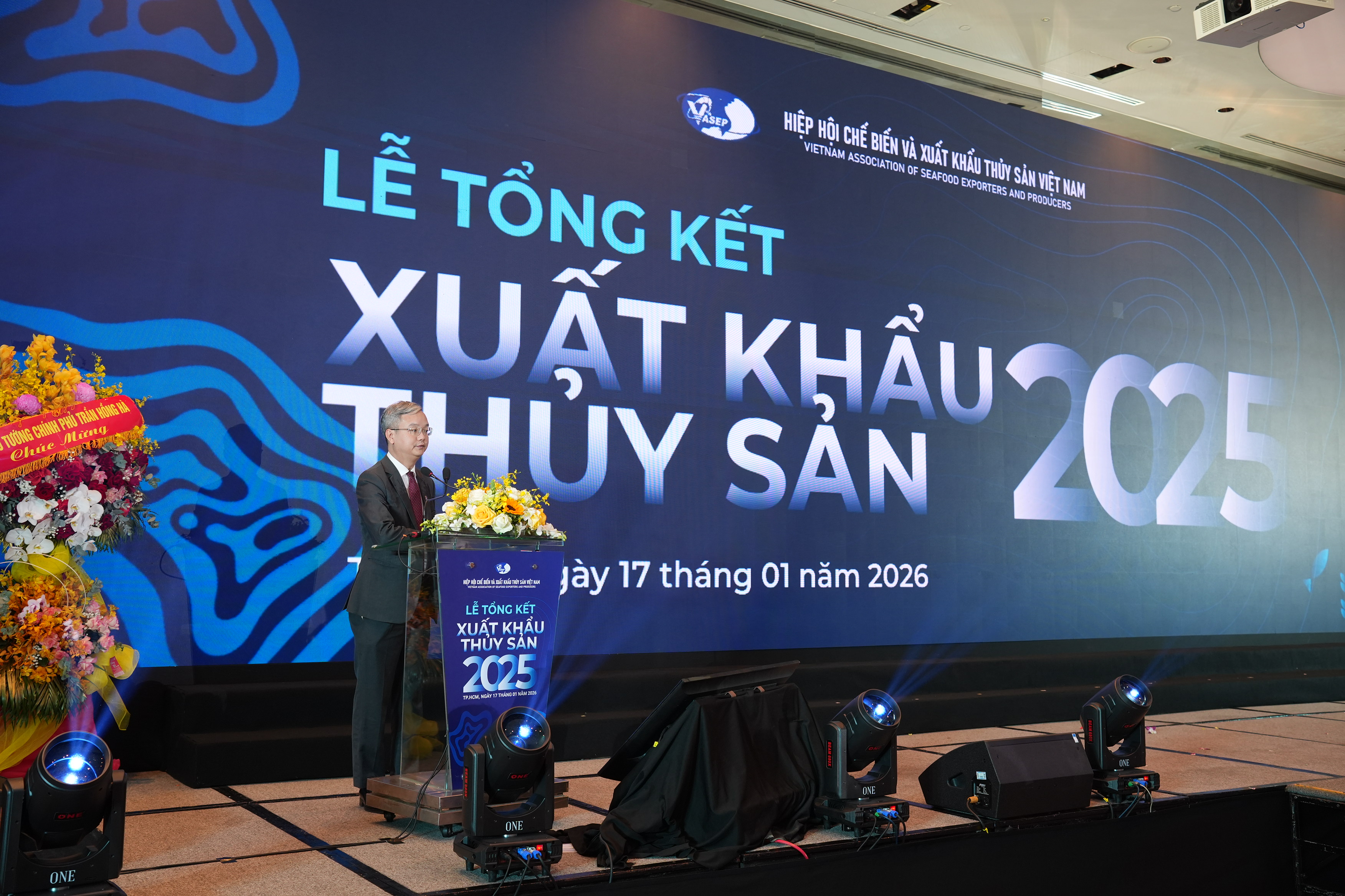 (vasep.com.vn) Ngày 17/01/2026, Hiệp hội Chế biến và Xuất khẩu Thủy sản Việt Nam (VASEP) tổ chức Lễ Tổng kết Xuất khẩu Thủy sản năm 2025 tại Khách sạn Sheraton Saigon, TP. Hồ Chí Minh. Sự kiện là dịp nhìn lại bức tranh toàn ngành trong một năm nhiều biến động, ghi nhận đóng góp của cộng đồng doanh nghiệp, đối tác và cơ quan quản lý, đồng thời lan tỏa thông điệp phát triển cho giai đoạn tới: nâng sức cạnh tranh đi đôi với nâng chuẩn bền vững.