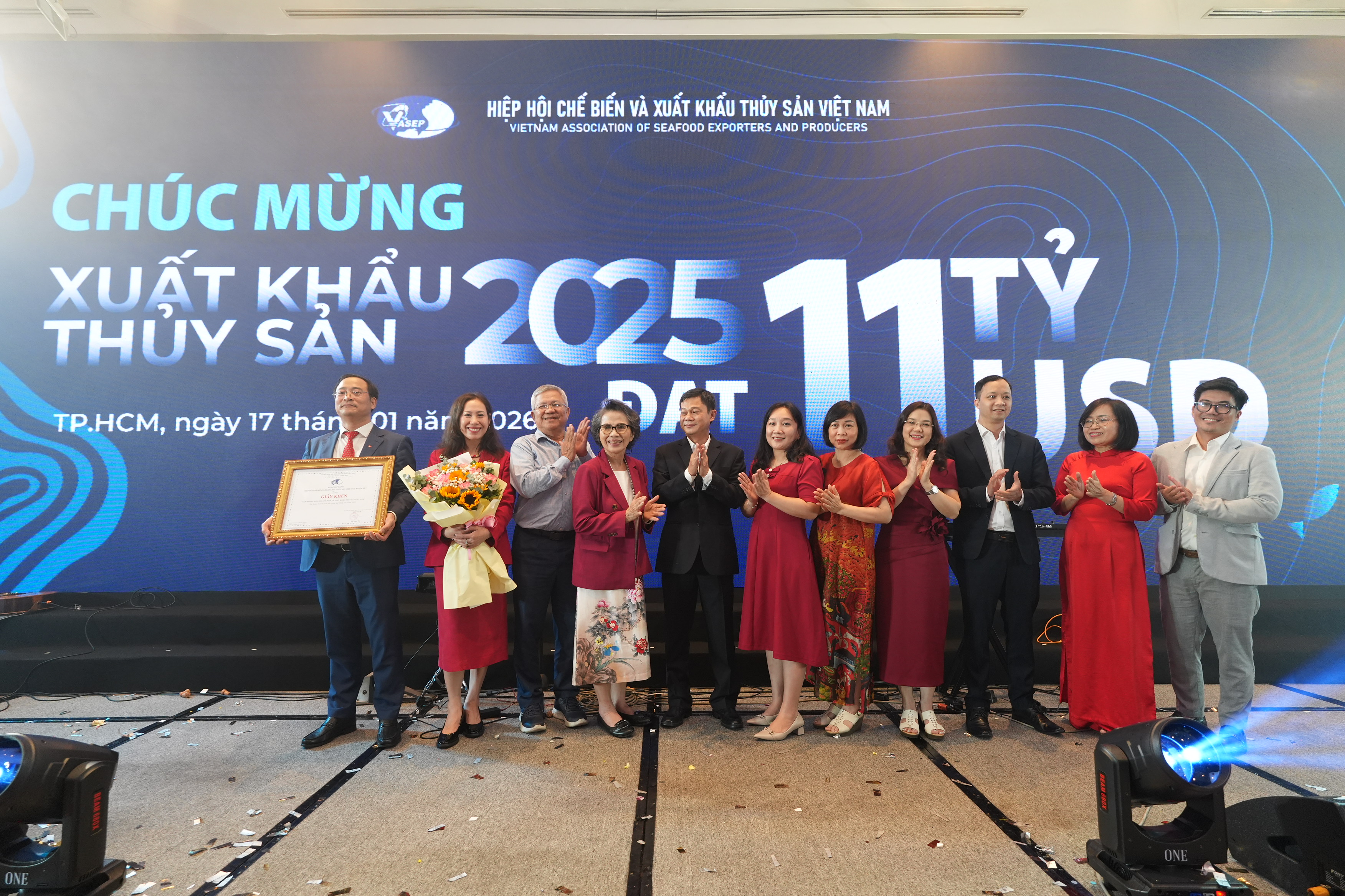 Với tinh thần “cùng nhìn lại để cùng đi xa hơn”, VASEP triển khai chuỗi hoạt động tri ân và ghi nhận sự hỗ trợ và đồng hành của các cơ quan quản lý nhà nước: Cục Thủy sản và Kiểm ngư, Cục Chất lượng, Chế biến và Phát triển Thị trường (NAFIQPM) – Bộ Nông nghiệp và Môi trường, Cục XTTM, Cục XNK Cục Quản lý và Phát triển Thị trường trong nước – Bộ Công Thương, Cục Hải Quan – Bộ Tài chính. Để chúc mừng cho kỷ lục mới trên 11 tỷ USD, VASEP vinh danh 62 doanh nghiệp xuất khẩu xuất sắc trong năm 2025 và vinh danh các cá nhân có đóng góp tích cực cho cho hoạt động chính sách của Hiệp hội; chào mừng hội viên mới.