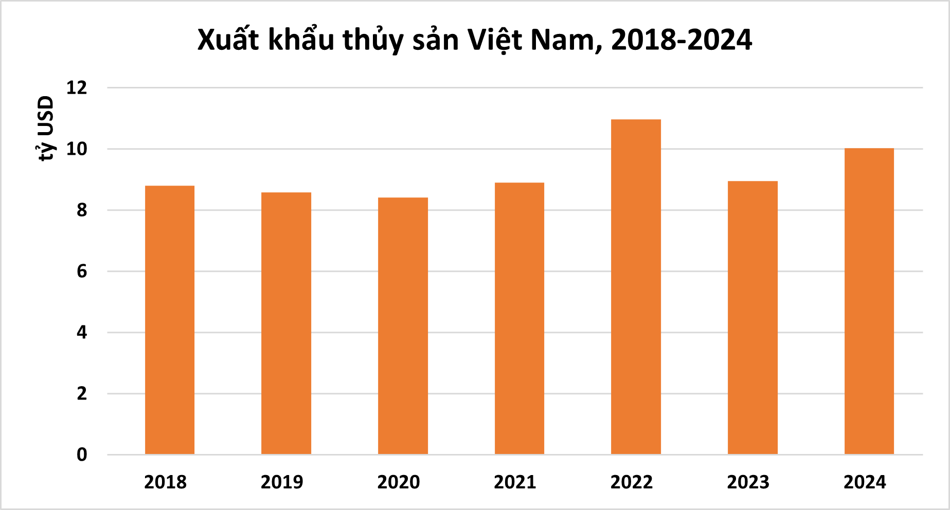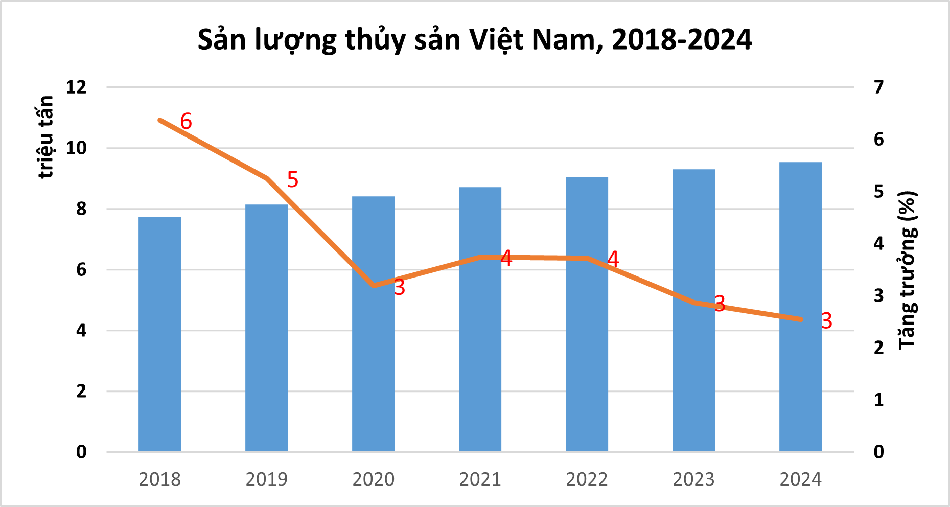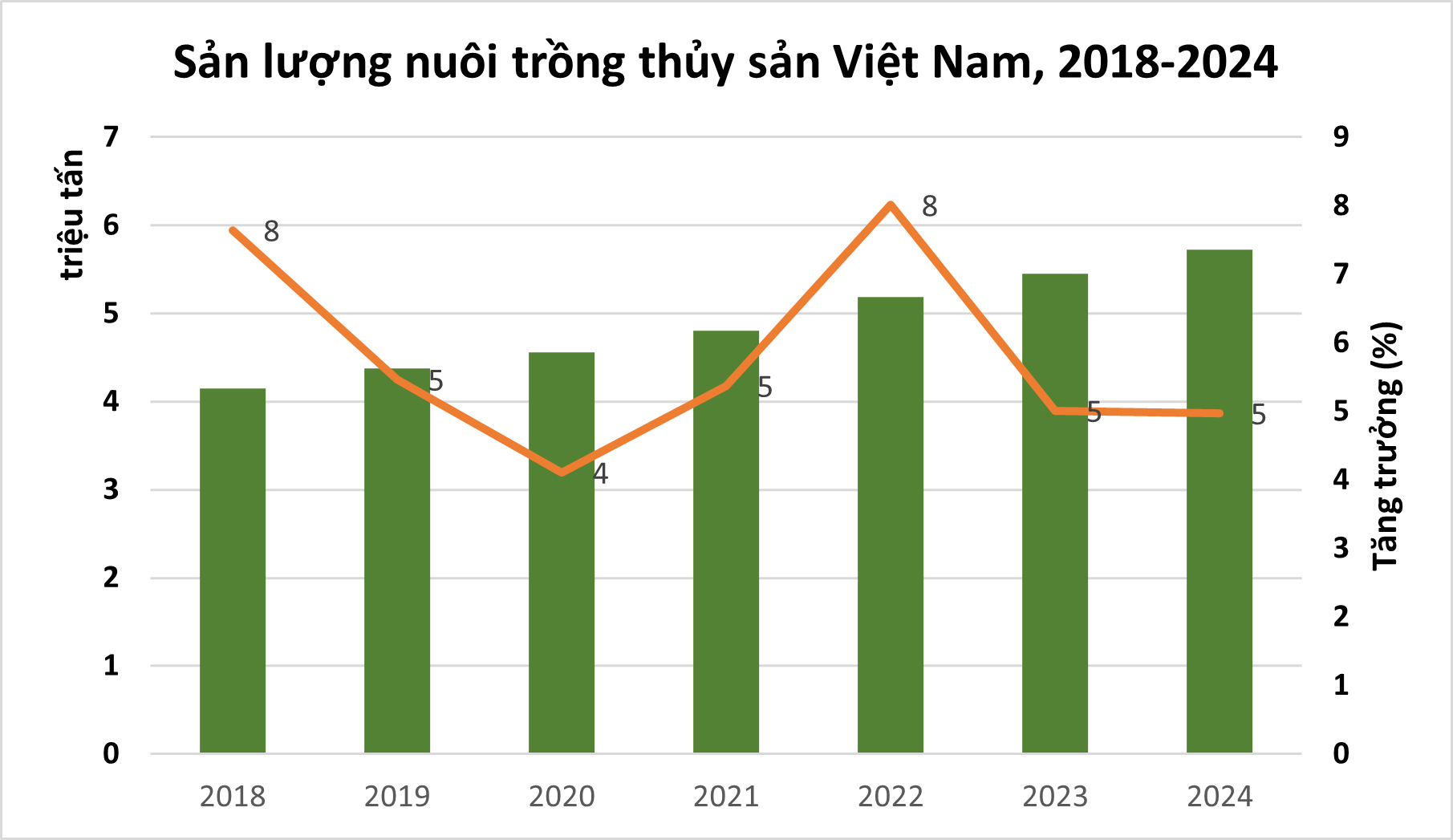 Từ 2018-2024: Sản lượng nuôi trồng thủy sản của Việt Nam tăng từ 4,1 triệu tấn lên 5,7 triệu tấn, tăng 38%. Nuôi trồng thủy sản phục vụ cho xuất khẩu tập trung chủ yếu ở ĐBSCL (chiếm 95% tổng sản lượng cá tra và 80% sản lượng tôm).