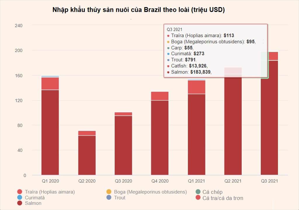 Trong số các loài cá nuôi chính được nhập khẩu vào Brazil trong quý III/2021, cá hồi một lần nữa dẫn đầu danh sách, với tổng trị giá 184 triệu USD và chiếm 90,3% tổng kim ngạch nhập khẩu, tăng 93% so với cùng kỳ năm ngoái và 14% so với quý trước.