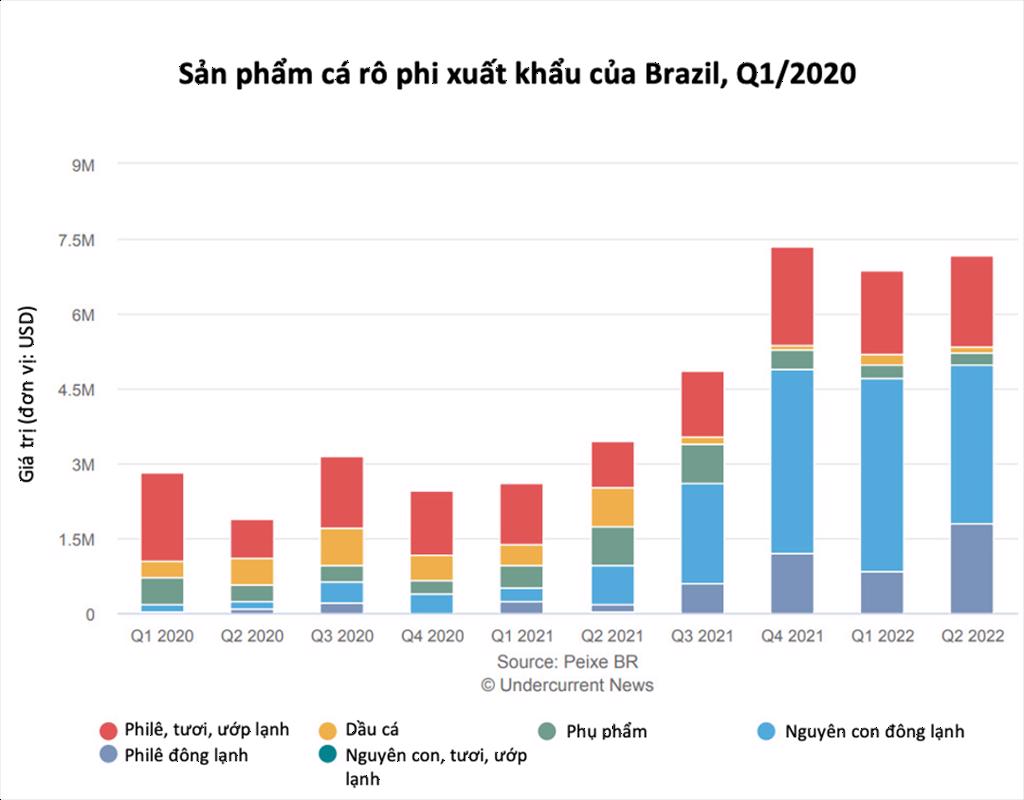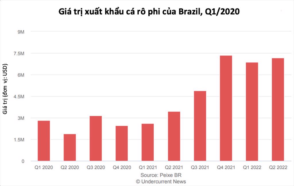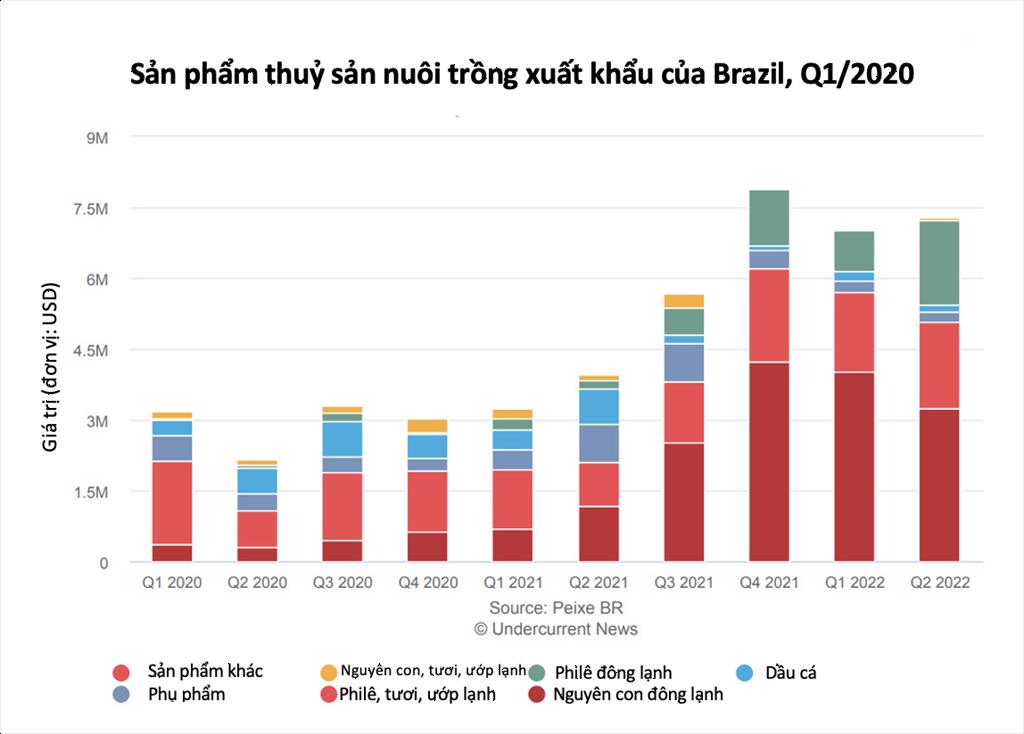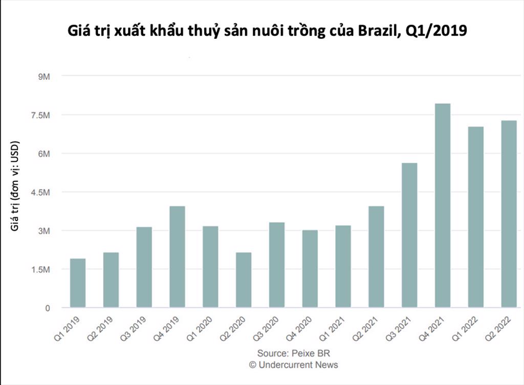 Doanh số bán cá rô phi trên toàn thế giới của Brazil chiếm 98% tổng kim ngạch XK thủy sản nuôi trồng của nước này, đạt tổng trị giá 6,8 triệu USD và tăng 166% so với Q1/2021.